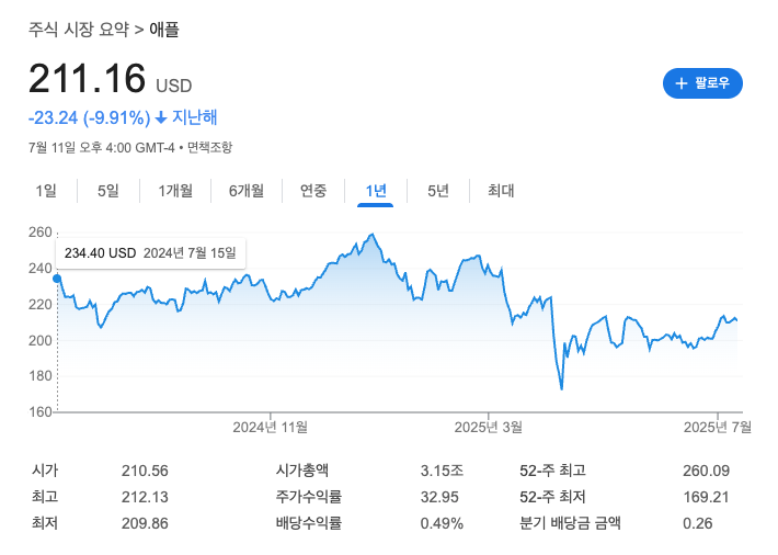 • 애플: 7월 초 210달러 대에서 시작해 216달러까지 상승하며 일시적인 반등세를 보였으나, 이후 다시 211달러 수준으로 조정을 받았습니다.