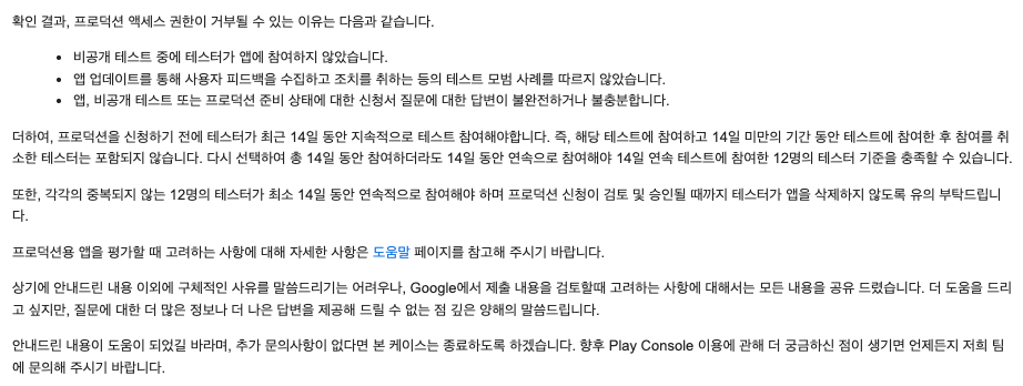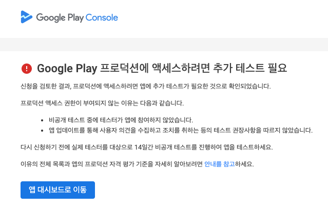 A. 세션 수·테스트 기간·릴리스 노트 3요건을 누락했을 확률이 높아요. '테스터가 앱을 삭제한 적이 없는지', '14일 타이머가 제대로 돌았는지' 체크한 후 버전 하나를 더 올리고 다시 14일을 돌리면 대부분 통과돼요.