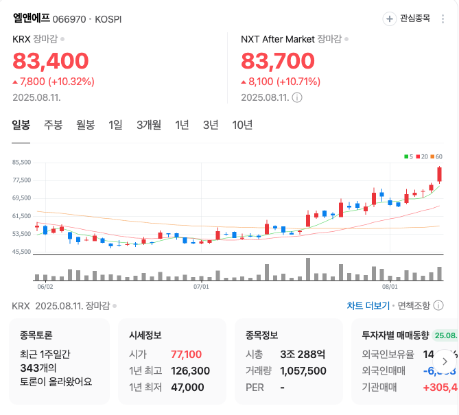 최근 투자 앱을 열자마자 엘앤에프 주가가 10% 이상 급등한 모습에 깜짝 놀랐어요.