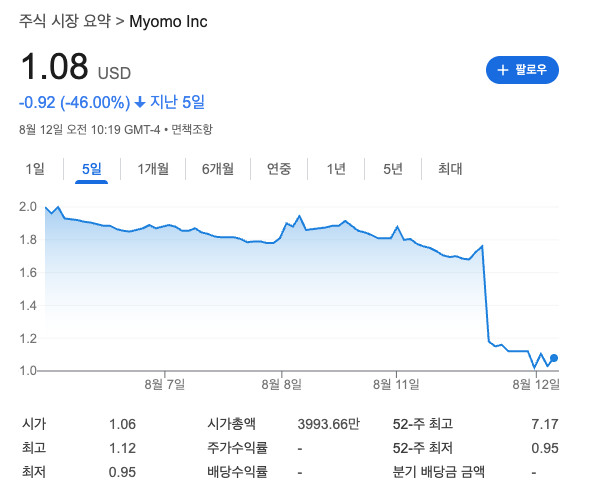 "마이모(Myomo)가 2분기 실적 발표 후 장외 거래에서 주가가 무려 42% 급락했다"는 소식이었죠.