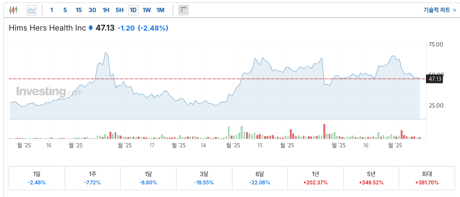 며칠 전 힘스 앤 허스(Hims & Hers) 주가가 갑자기 하락한 걸 보고 깜짝 놀랐어요.