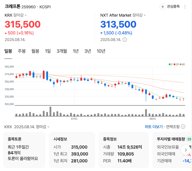 크래프톤 일봉차트 출처. 네이버페이증권