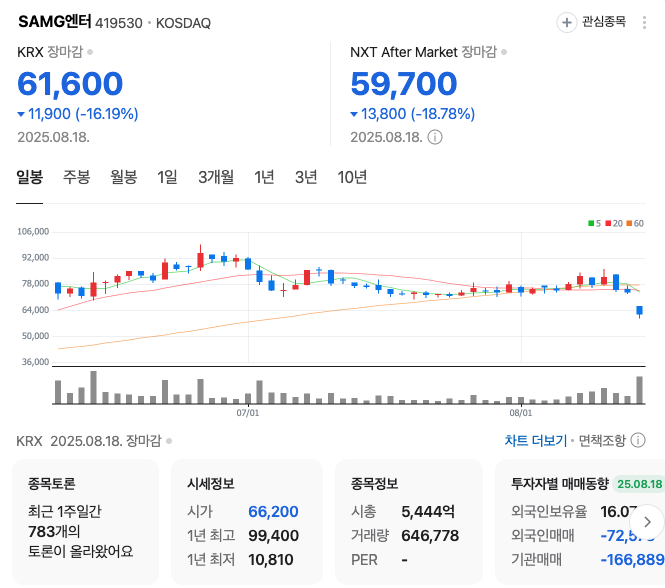 8월 18일 오후 SAMG엔터 주가는 1만2,300원(16.7%) 하락한 6만1,200원에 거래됐어요.
