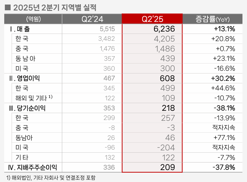 - 인디 브랜드·색조 성장세로 매출은 늘었지만, 기존 스킨케어 주력 고객사 부진 및 선케어 판매 정체가 이익 성장을 제한했어요. 국내 법인이 3,281억(+11%)의 매출과 490억(+11%) 영업이익을 기록했지만, 미국법인은 영업손실, 중국법인은 매출 감소를 겪었습니다. 인디 브랜드 수출 확대와 신규 브랜드 발주가 하반기 기대 요인! 실제 회의에서 "인디 브랜드 쪽이 활기차고, 신규 영업 기회가 열리고 있다"는 이야기가 자주 나왔어요.