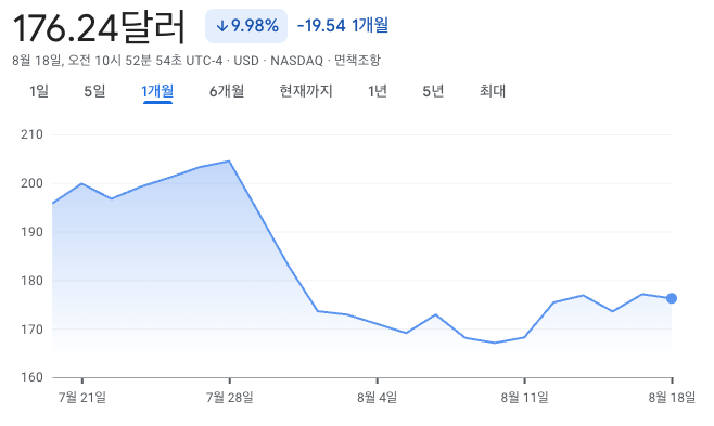 현재 주가는 177달러 수준으로, 올해 최고가인 210.39달러에 근접했던 때와 비교하면 여전히 힘있게 버티고 있는 느낌입니다.