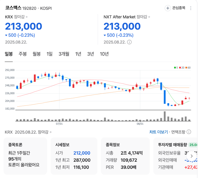 코스맥스는 2분기에 뚜렷한 실적 개선을 보이며 213,000원에서 견고한 주가를 유지하고 있어요.
