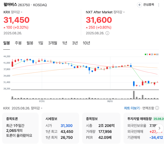 올해 2분기 실적 발표와 함께 신작 '붉은사막' 출시가 다시 2026년 1분기로 미뤄진 소식에 주가는 순식간에 25% 이상 급락했어요.