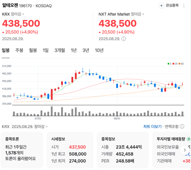 오늘(2025년 8월 29일) 오전 9시 25분 기준으로 알테오젠 주가는 전일 대비 4.07% 상승한 43만 5천 원에 거래 중이에요.