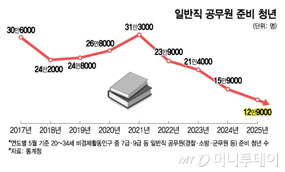 작년 5월 기준 공무원 준비생은 겨우 12만 9천 명으로, 전년 대비 3만 명 이상 감소했습니다.