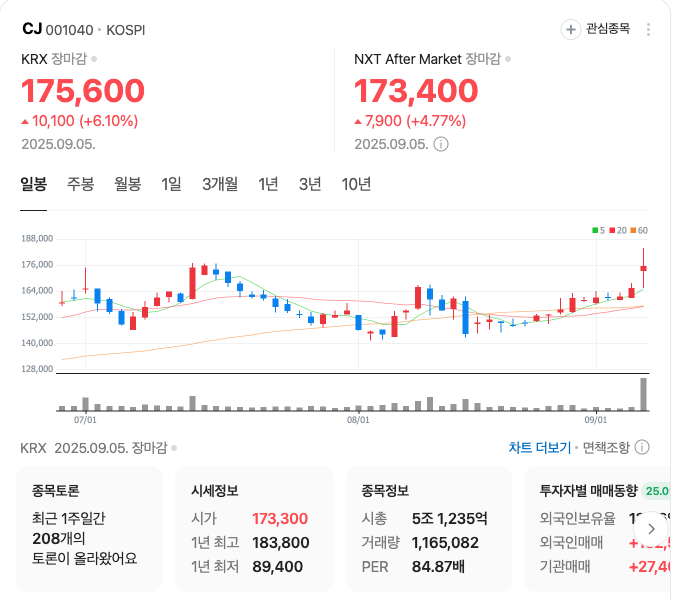 CJ가 올리브영과 합병 절차를 검토한다는 소문에 장 초반 주가가 52주 신고가인 18만 3800원까지 급등하면서,