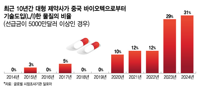최근 10년간 대형 제약사가 중국 바이오텍으로부터 기술도입한 물질의 비율 출처. 머니투데이